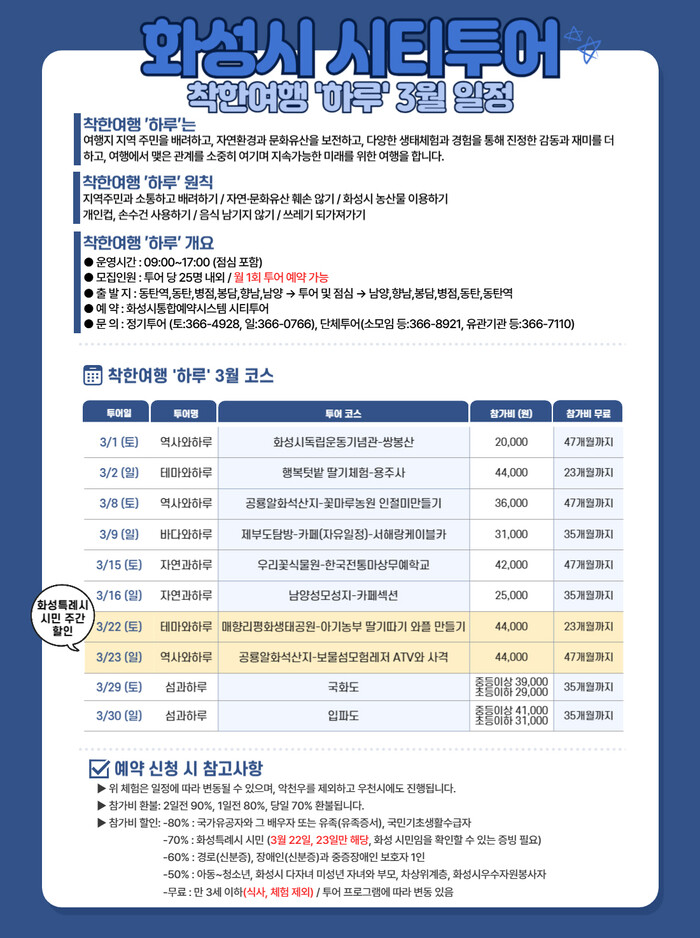 한편, 화성시 시티투어 3월 프로그램은 신규 참가자는 20일 오후 5시부터, 그 외 참가자는 21일 오후 5시부터 예약할 수 있다.