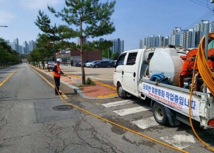 사진/가로수에 염분 중화제를 뿌리고 있다.(사진제공=수원시)