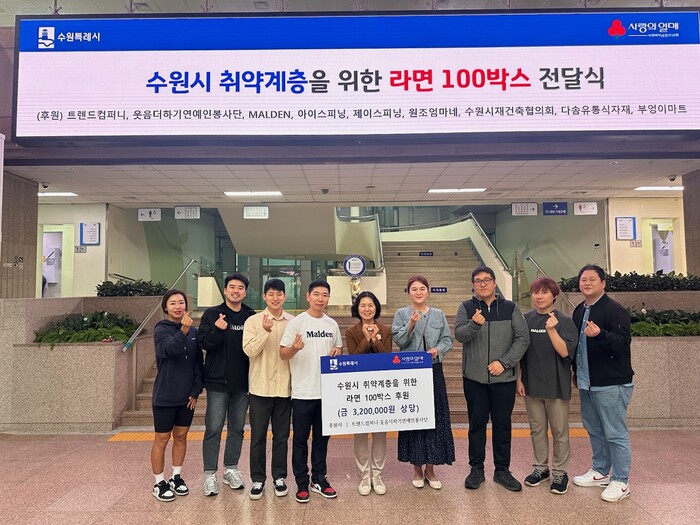 트렌드컴퍼니·웃음더하기연예인봉사단 등은 “지역사회와 어려운 이웃에게 전달해달라”며 라면 100상자(320만 원 상당)을 수원시에 기부했다.
