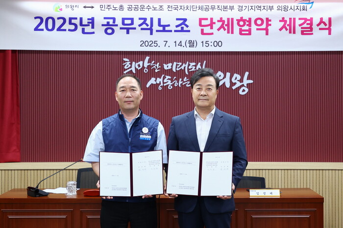 의왕시(시장 김성제)는 공공운수노동조합 전국지방자치단체공무직본부 경기지역지부 의왕시지회(지회장 이태겸)와 14일 시청 중회의실에서‘2025년도 공무직 단체협약’을 체결했다고 밝혔다.