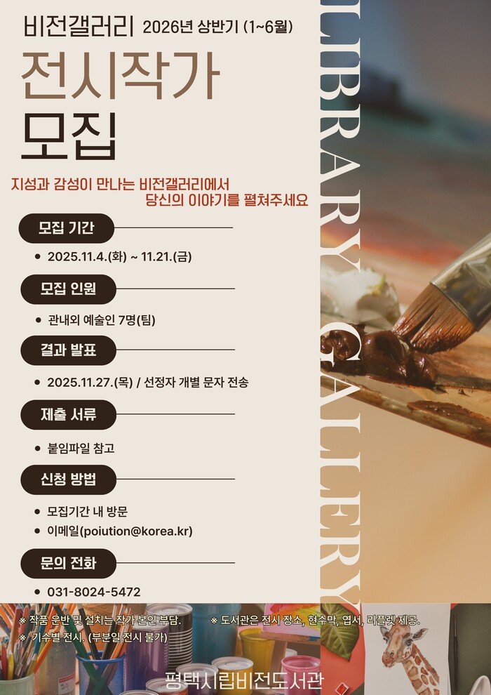 평택시립 비전도서관에서는 관내.외 예술가와 신진 작가에게 폭넓은 전시 기회를 제공하고, 시민들이 예술을 보다 가까이에서 누릴 수 있는 기회를 제공하고자 오는 11월 4일부터 21일까지 2026년 상반기 비전갤러리 전시 작가를 모집한다.