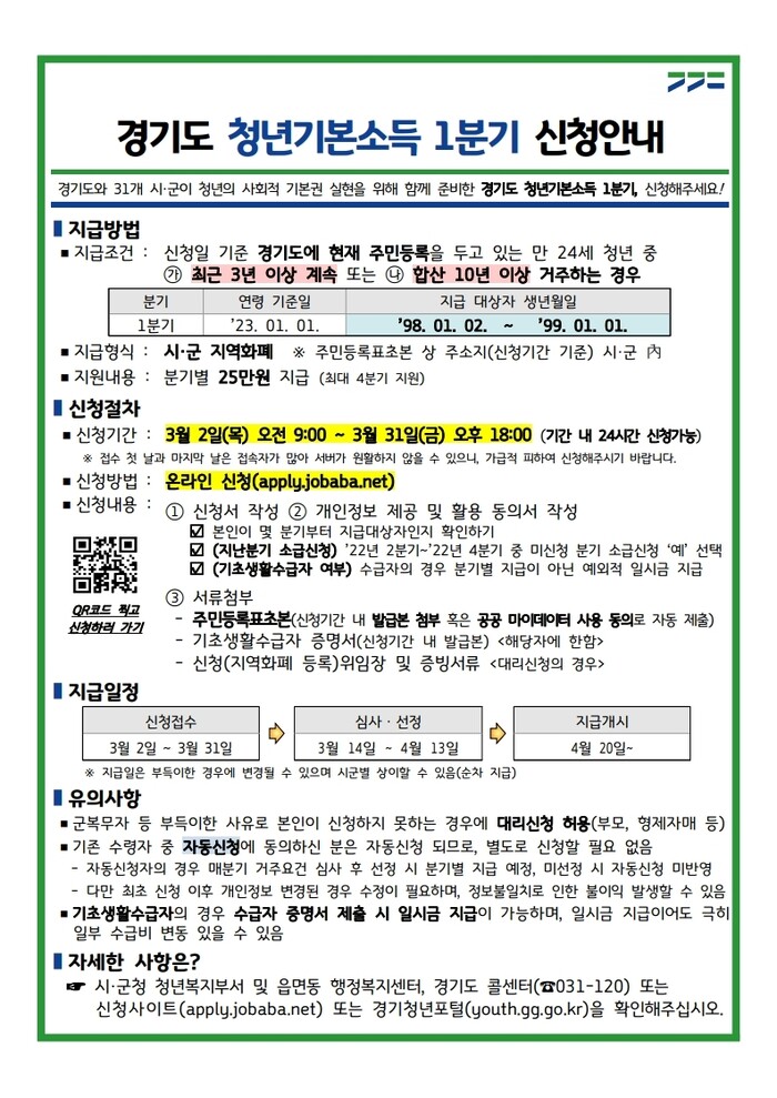 수원시가 만 24세 청년을 대상으로 하는 ‘2023년 1분기 경기도 청년 기본소득’ 지급 신청을 3월 31일 오후 6시까지 받는다.
