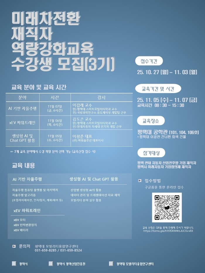 교육 운영기관인 평택대학교는 강사진 구성과 실습환경 및 교육 품질 관리 등 전체 과정을 직접 담당하며, 1·2기 교육을 통해 축적된 피드백을 반영해 3기 과정에서는 AI·전기전장 융합 분야 및 생성형 AI 실습을 강화했다.