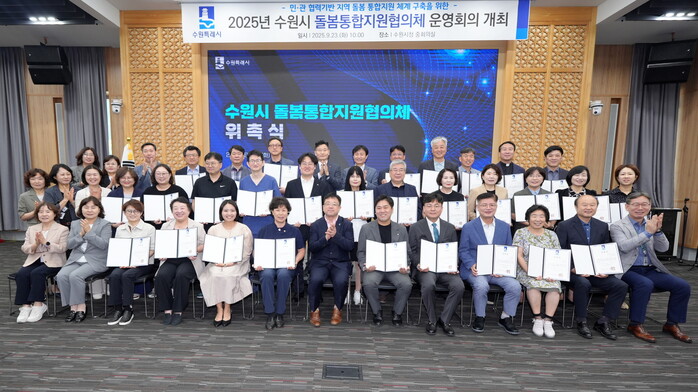 수원시는 23일 시청 중회의실에서 ‘수원시 돌봄통합지원협의체’ 위촉식을 열었다. 2024년 3월 제정된 ‘돌봄통합지원법’에 따라 기존 민·관·학 통합돌봄추진위원회를 통합·개편해 협의체를 구성했다.