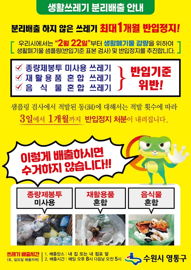 수원시 영통구(구청장 김용덕)가 오는 2.22일부터 시행되는 ‘반입기준 위반 생활폐기물 반입정지’로 인해 주민들이 불편을 겪지 않도록 주민홍보에 힘쓰고 있다.