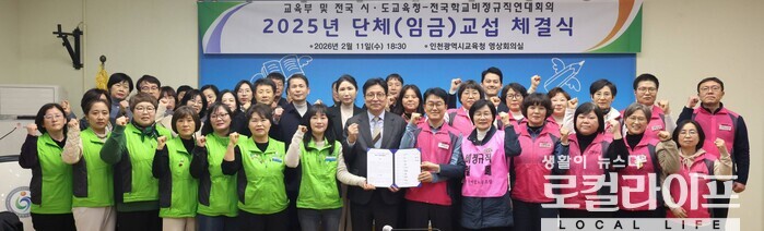 [인천=로컬라이프] 송준형 기자 = 인천광역시교육청은 2월 11일 교육부 및 전국 17개 시·도교육청, 전국학교비정규직연대회의(이하 '학비연대')와 '2025년 단체(임금)교섭 협약'을 체결했다.