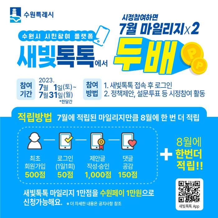 수원시 시민참여 플랫폼인 ‘새빛톡톡’에서 활동하면 지역화폐로 전환할 수 있는 마일리지가 적립된다. 수원시는 새빛톡톡 정식 운영을 기념해 7월 한 달 동안 마일리지를 두 배로 주는 ‘마일리지 더블 적립이벤트’를 연다.