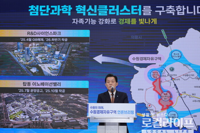 이 시장은 "(민선8기 3년 간) 수원의 발전을 가로막았던 문제를 잇달아 해결하며 경제특례시를 완성하기 위한 기반을 탄탄하게 구축했다"며 "수원 R&D 사이언스파크 조성 사업 부지의 개발제한구역 규제가 해제돼 본격적으로 사업을 추진하고 있다. 탑동 이노베이션밸리는 올해 7월 토지 분양을 시작한다. 지난 4월에는 경기경제자유구역 추가 지정 후보지 공모에 선정돼 '수원경제자유구역' 지정을 향한 첫 관문을 통과했다"고 수원경제자유구역 추진의 배경과 경과를 설명했다.
