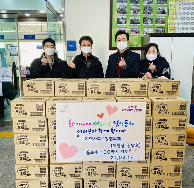 화서1동 지역사회복장협의체 권남호 위원장은 지난 18일 화서1동 행정복지센터에 저소득 가구를 위한 음료수 100박스를 기부했다.