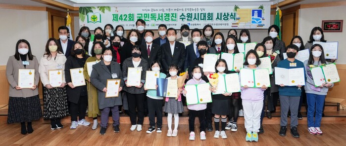 새마을문고수원시지부가 21일 팔달구 수원시새마을회관 대회의실에서 ‘제42회 국민독서경진 수원시대회’ 시상식을 열고, 입상자들에게 상장을 수여했다.