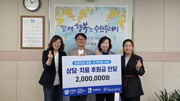수원대학교 공공정책대학원 자원봉사단이 “아동학대 예방과 조기지원 사업 대상자 지원을 위해 사용해달라”며 수원시에 200만 원을 기부했다.