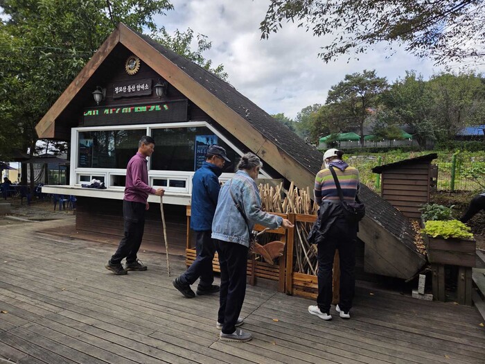 사진/등산객들이 광교산 등산 안내소 앞에 있는 지팡이를 고르고 있다.(사진제공=수원시)