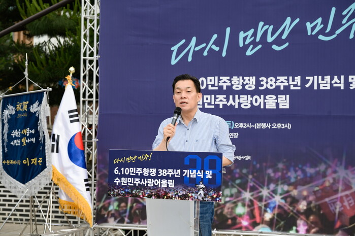 이재준 수원시장이 7일 남문로데오 청소년문화공연장에서 열린 ‘제38주년 6·10민주항쟁 기념식’에서 “38년 전 6.10 민주항쟁 역사가 있었기에 민주주의가 이어지고 있다”고 말했다.