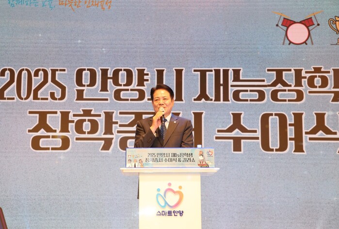 [안양=로컬라이프] 송준형 기자 = 최대호 안양시장은 2025 안양시 재능장학생 장학증서 수여식 날 무대 위에서 한 사람 한 사람에게 장학증서를 건넸다.