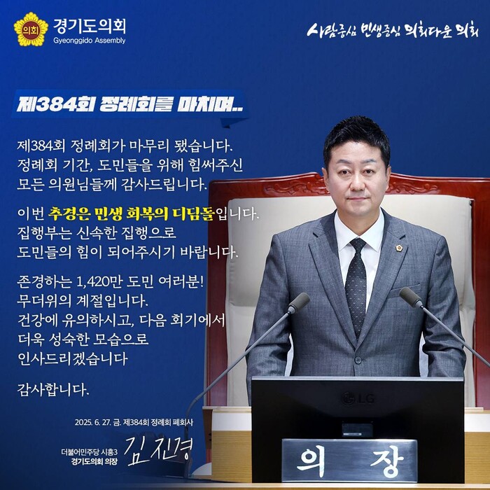 아울러 ‘존경하는 1,420만 도민 여러분! 무더위의 계절입니다. 건강에 유의하시고, 다음 회기에서 더욱 성숙한 모습으로 인사드리겠습니다‘라고 덧붙였다.
