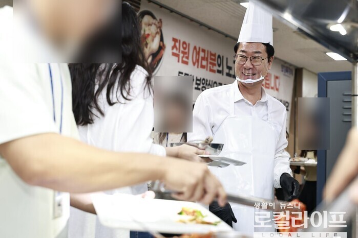 [화성=로컬라이프] 송준형 기자 = 정명근 화성특례시장은 22일, 구내식당에서 직원들에게 삼계탕 배식을 하며 함께 식사했다.