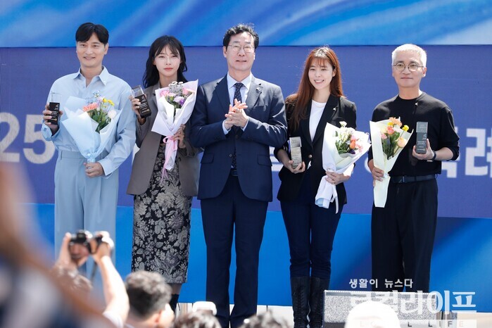 | ▲ 정명근 화성시장(가운데)이 ‘제14회 화성 뱃놀이 축제’ 개막식에서 홍보대사 위촉 후 기념촬영을 하고 있다. (사진출처=정명근 페이스북) |