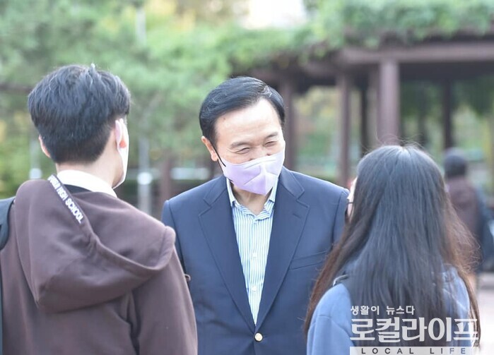 | ▲ 임태희 경기도교육감이 늘푸른고를 방문해 학생들을 격려하고 있다. (사진출처=임태희 페이스북) |