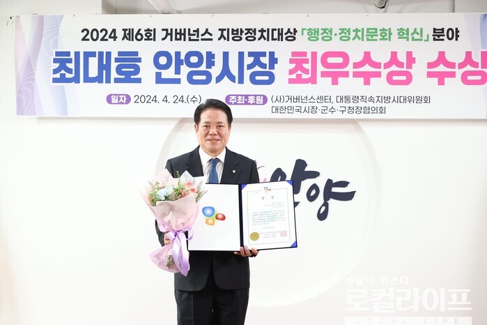 [안양=로컬라이프] 송준형 기자 = 최대호 안양시장이 “2024 제6회 거버넌스 지방정치대상 ‘행정·정치문화 혁신’ 최우수상”을 수상했다.