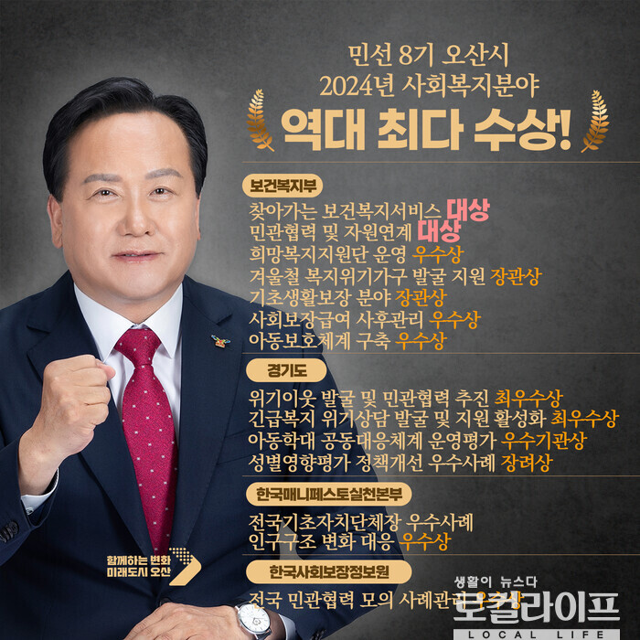 [오산=로컬라이프] 송준형 기자 = 오산시가 ‘2024년 사회복지분야’ 역대 최다 수상을 기록했다.