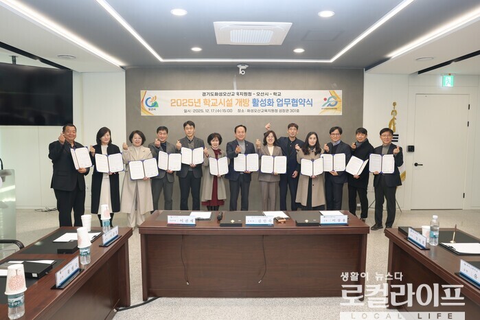 [오산=로컬라이프] 송준형 기자 = 오산시는 경기도화성오산교육지원청 및 각 학교와 ‘2025년 학교시설 개방 활성화 업무협약’을 체결했다.