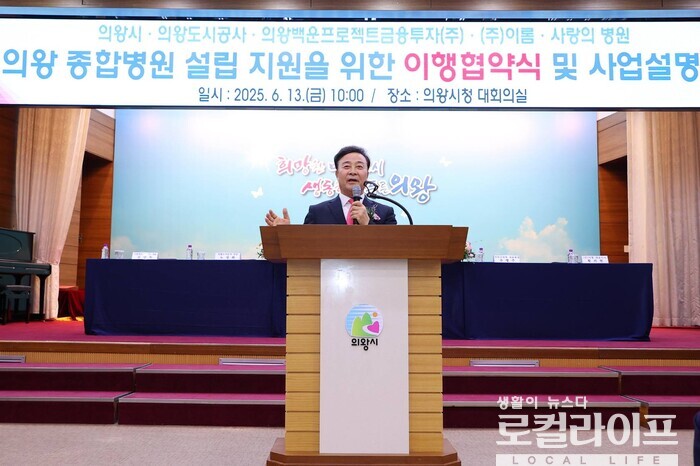 [의왕=로컬라이프] 송준형 기자 = 의왕시가 의왕도시공사, 의왕백운프로젝트금융투자(주), ㈜이롬, 사랑의병원과 '의왕 종합병원 설립 지원을 위한 이행협약식 및 사업설명회'를 진행했다.