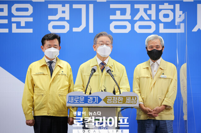 | ▲ 9월 15일 오후 경기도청 브리핑룸에서 이재명 경기도지사, 곽상욱 경기도 시장군수협의회장(오산시장), 박근철 경기도의회 더불어민주당 대표의원 등이 참석한 가운데 제3차 경기도 재난기본소득 지급 세부내용 관련 기자회견을 하고 있다. (사진제공=경기도) |