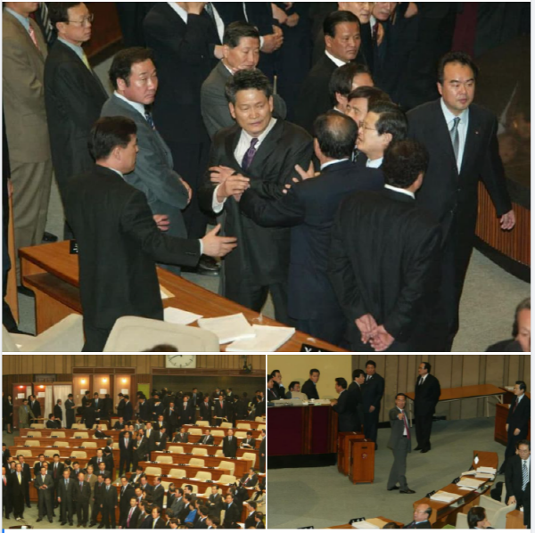 김남국 의원은 “첫번째 장면, 2004년 탄핵 반대를 하면서 찬성하는 한나라당 의원과 함께 스크럼을 짰던 장면이다. 표결에 반대투표하면서 탄핵가결을 위해 방탄 스크럼을 짠 것은 무엇일까. 둘째 장면, 이낙연 후보가 탄핵 찬성 표결에 참여하기 위해서 당 지도부와 새벽에 전격적으로 본회의장에 진입했다는 보도는 오보인가. 세째 장면, 또 당시 열린우리당 송영길 의원이 한나라당 의원들에게 항의하는 모습을 이낙연 의원이 무심히 바라보는 사진도 그럼 거짓인가”라고 물음을 던졌다.