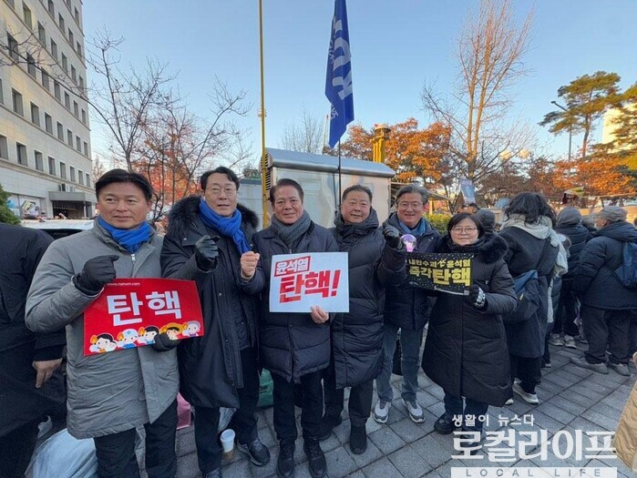 | ▲ 최대호 안양시장(왼쪽에서 세 번째)을 비롯한 더불어민주당 기초단체장들이 '윤석열 탄핵 집회'에 참석하고 있다. (사진출처=최대호 페이스북) |