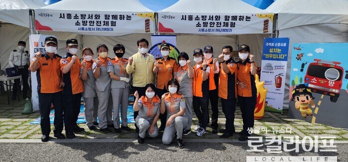 | ▲ 임병택 시흥시장(노란 상의)이 자원봉사자들과 기념사진을 촬영하고 있다. (사진출처=임병택 페이스북) |