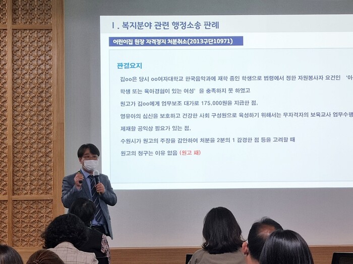 오도환 변호사는 복지 분야 행정처분·소송 사례·민간위탁 관련 사항 등을 설명하고, “송무에 대해 잘 알고 있으면 행정 소송 발생을 줄이고, 소송에 효과적으로 대응할 수 있어 행정력 낭비를 줄일 수 있다”고 말했다.