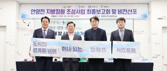 20일 오후2시 광명시청2층 중회의실에서 최대호 안양시장,박승원 광명시장,하은호 군포시장,안치권 의왕 부시장을 비롯해 각 도시 관계 공무원,자문위원,용역사 등이 참석한 가운데‘안양천 지방정원 조성사업 기본 및 실시설계용역’최종보고회를 열었다.