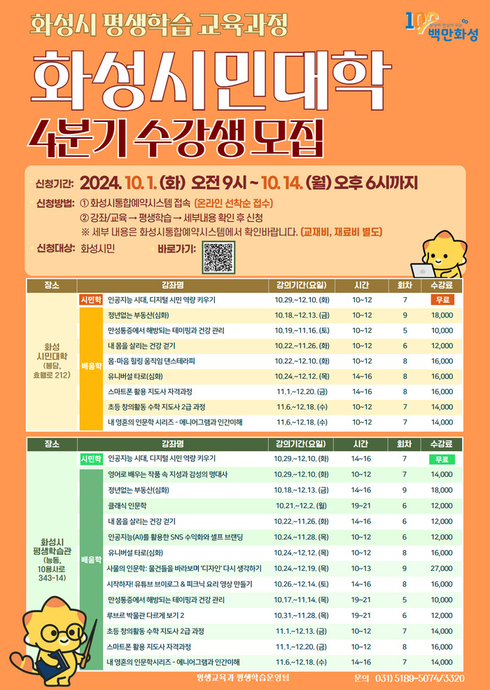 모집강좌는 시민학, 배움학 영역의 총 23개 강좌이며 수강신청은 만 18세 이상 화성시민이면 누구나 신청 가능하다.