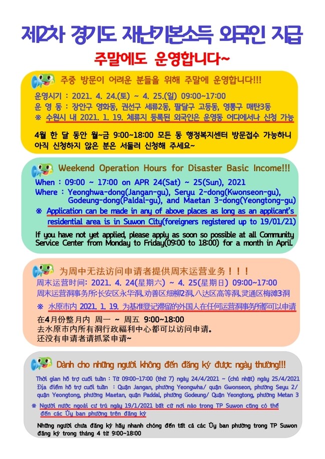 “4월 마지막 주말, 제2차 경기도 외국인 재난기본소득 신청을 현장 접수합니다.” 수원시가 토요일인 24일과 일요일인 25일 양일간 제2차 경기도 외국인 재난기본소득 접수창구를 운영한다.