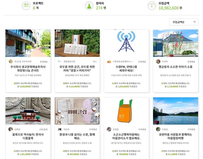 펀딩을 진행한 프로젝트는 수원FM, 안테나를 세워주세요!(수원마을공동체미디어사회적협동조합) 모두를 위한 공간, 모두를 위한 커피 꿈틀 X 커피가이(꿈틀협동조합) 주식회사 광교문화예술투자사 희망빛나눔콘서트(광교1동주민자치회) 소곤소곤행복마을에는 마을관리소가 필요해요(소곤소곤행복마을) 행궁동의 사소한 이야기를 담은 상품만들기(드로잉판) 환경과 나를 살리는 소창, 함께 해요(파마클럽) 블록으로 역사 놀이 : 한국사 디폼블록(역동) 호반마을 사람들과 함께하는 마을힐링여행(행복마을만들기) 등이다.