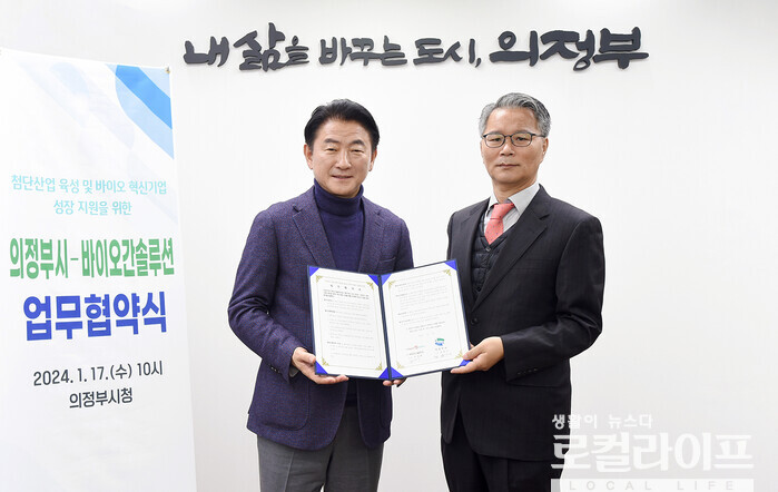 [의정부=로컬라이프] 송준형 기자 = 의정부시와 바이오간솔루션이 ‘첨단산업 육성 및 바이오 혁신기업 성장 지원을 위한 업무협약’을 체결했다.