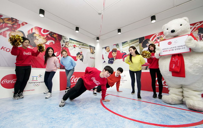 2018 평창동계올림픽 월드와이드 파트너사인 코카-콜라는 10일 오전 서울 홍익대 정문 맞은편에 위치한 ‘코카-콜라 자이언트 자판기’에서 대한민국 쇼트트랙 대표팀의 선전을 기원하는 짜릿한 응원의 순간을 선보였다.