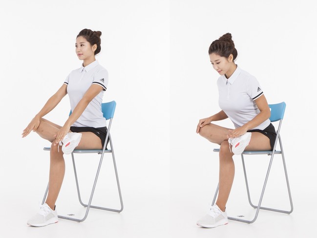 이러한 경우에는 ‘어서오세요 스트레칭’으로 허리 주변 근육과 인대를 이완시켜 주는 것이 좋다. 허리를 곧게 펴고 앉은 자세에서 오른쪽 발목을 왼쪽 무릎 위에 올린다. 가슴을 앞으로 미는 듯한 느낌으로 상체를 천천히 아래로 숙여 4초간 유지한다. 이때 양손은 무릎 위에 올려 놓는다. 이후 발을 바꿔서 4회씩 반복한다.
