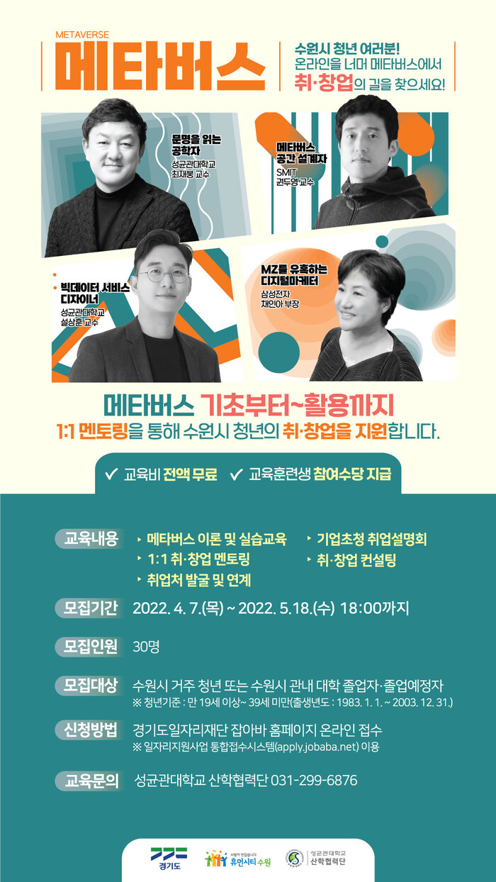 수원시가 성균관대학교와 협력해 진행하는 ‘메타버스 가상융합플랫폼 전문인력 양성 지원사업’ 참여자 모집 기간을 5월 18일 오후 6시까지 연장한다.