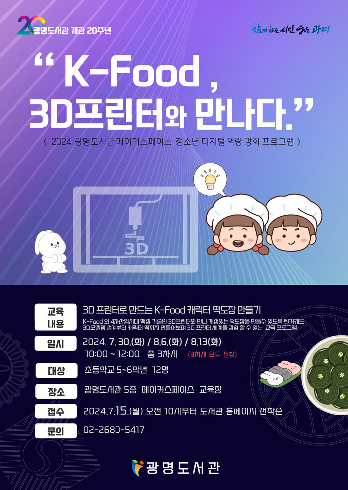 광명시 광명도서관 메이커스페이스는 여름 방학을 맞아 관내 초등학교 5~6학년 12명을 대상으로 7월 30일부터 8월 13일까지 매주 화요일 오전 10시부터 12시까지 총 3차에 걸쳐 청소년 디지털 역량 강화 프로그램 ‘K-Food, 3D프린터와 만나다’를 운영한다.