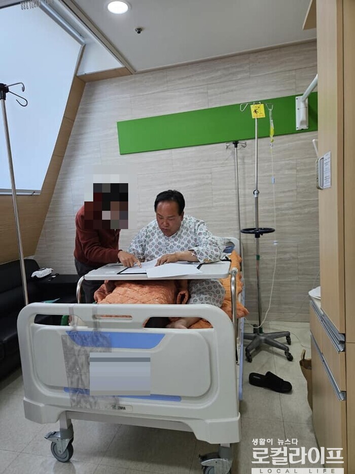 | ▲ 이권재 오산시장이 병상에서 시정에 임하고 있다. (사진출처=이권재 페이스북) |