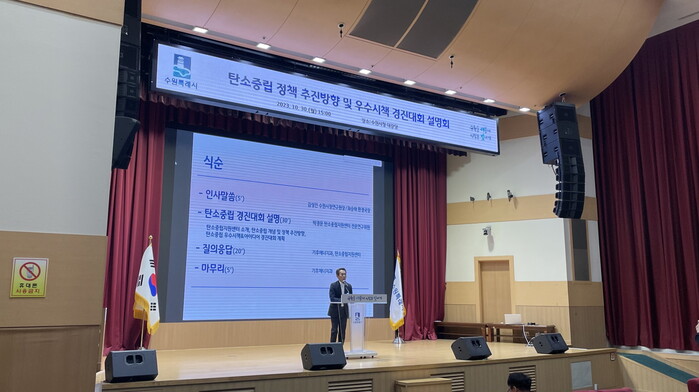수원시가 지난 30일 시청 대강당에서 수원시 전 부서(사업소 포함), 산하 공공기관을 대상으로 탄소중립 정책 방향 설명회를 열었다.