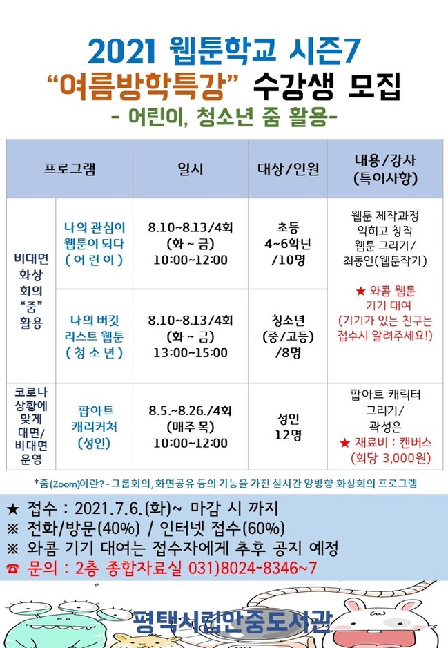 평택시립안중도서관이 문화체육관광부가 주최하고 한국만화영상진흥원이 주관한 <2021년 웹툰창작체험관 조성 및 운영> 공모사업의 운영기관으로 7년 연속 선정되어 프로그램을 운영하고 있다. 안중도서관은 상반기 프로그램에 이어 여름특강 프로그램 및 웹툰 작가 강연을 준비하고 있다.