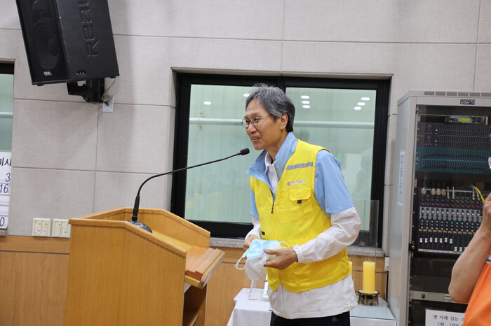 이날 올해 상반기 마지막 ‘사랑의 밥차’가 열린 고색동성당을 찾은 이영인 수원도시재단 이사장, 김성진 수원시정연구원장 등 11개 수원시 공공기관장은 간담회를 마치고 배식 봉사에 참여했다.