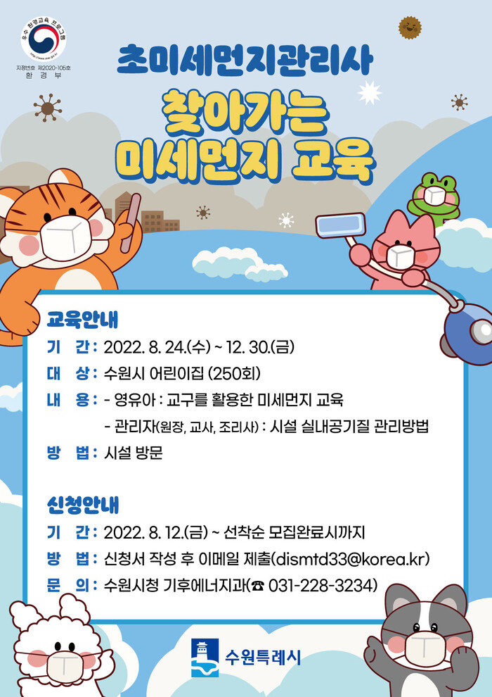 신청 서식 등 자세한 내용은 수원시 홈페이지(www.suwon.go.kr) ‘수원소식→시정소식’에 게시된 ‘초미세먼지관리사 찾아가는 미세먼지 교육 대상 시설 모집’에서 확인할 수 있다.