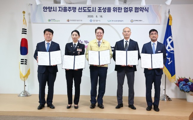 18일 안양시청 3층 상황실, 최대호 안양시장·라혜자 동안경찰서장·정준하 도로교통공단 교통과학연구원·주영창 차세대기술융합연구원장·주한돈 한국국토정보공사 경기지역본부장 5명 간 안양시 자율주행 선도를 위한 업무협약식이 진행됐다.