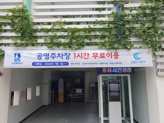 사진/1시간 무료 이용 안내 현수막을 게시한 공영주차장 입구.(사진제공=수원시)