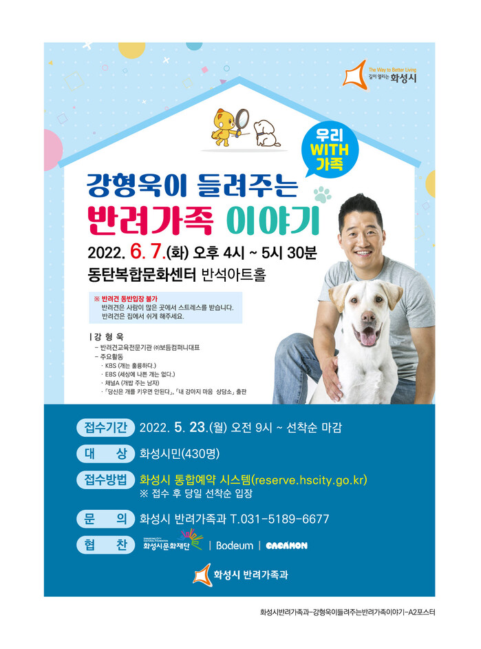 화성시가 반려가족을 위한 명사특강 ‘강형욱이 들려주는 반려가족 이야기’를 개최한다.