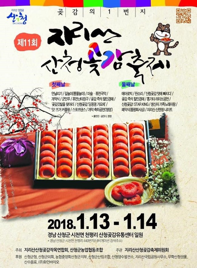 경남 산청군은 겨울철 최대 축제인 ‘제11회 지리산 산청곶감축제’를 2018년 1월13~14일, 양일간에 걸쳐 산청군 시천면 천평리 산청곶감유통센터 일원에서 개최한다고 밝혔다.