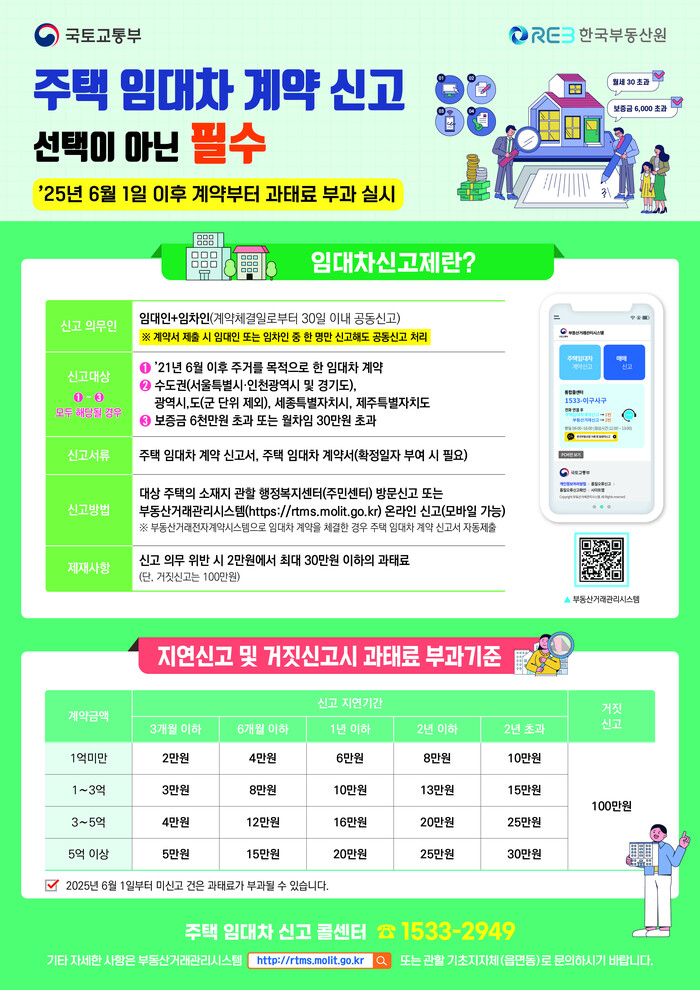 계도기간 종료로 2025년 6월 1일부터 보증금 6천만 원 또는 월차임 30만 원을 초과하는 임대차계약을 체결한 임대인·임차인은 계약일로부터 30일 이내에 임대차계약을 신고해야 한다.